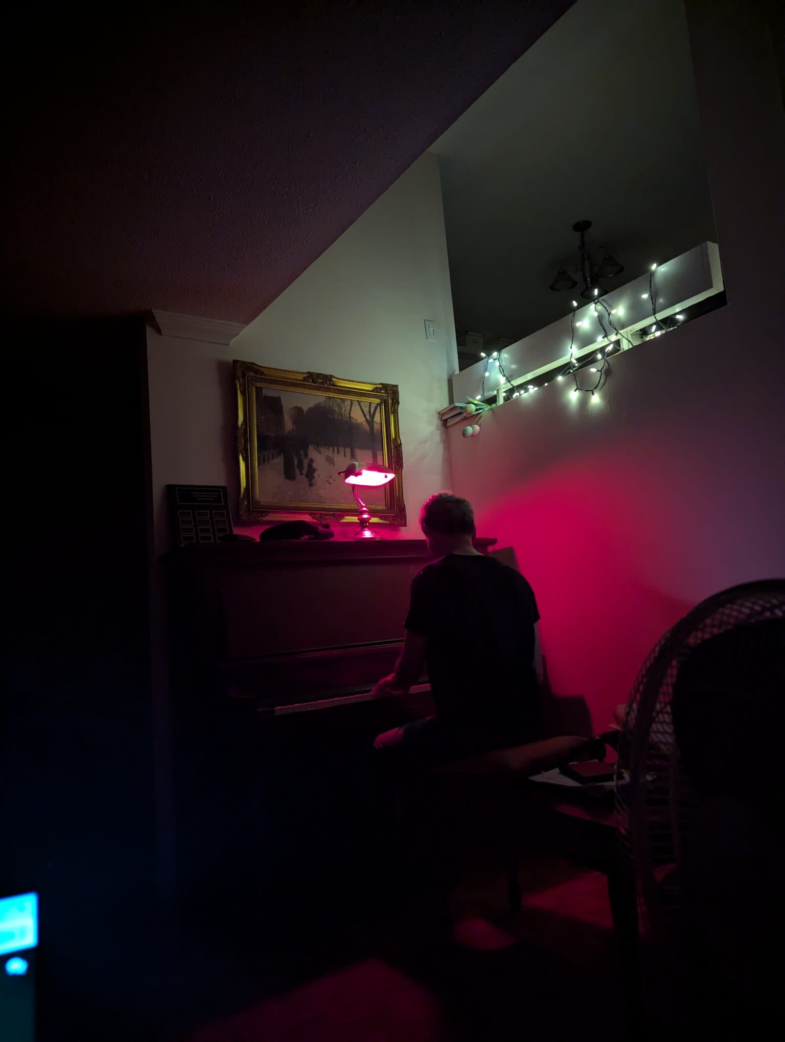 I have been playing for my wife and dog in the livingroom. I have a banker's lamp with a red bulb in it that sits on top of the piano. I turn off all the other lights and stage a 'Red Light Concert' to the delight of my audience.I also have a Yamaha electric piano that resides at my daughter's cottage. I am at the cottage now. I don't like playing it near as much as the acoustic piano at home. There's a full drum set as well here and the snare rattles when I play.